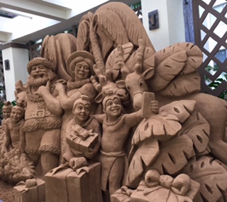 シェラトンワイキキのロビーで、いつも私たちの目を楽しませてくれるSandsational Sand Sculptingさんの砂の彫刻クリスマスシーズンになると、エントランスの部分にも大きな作品が登場します今年はこれ自撮りするサンタファミリー(爆)そしてロビーの彫刻は、Mr. & Mrs. サンタラブラブでんがな〜