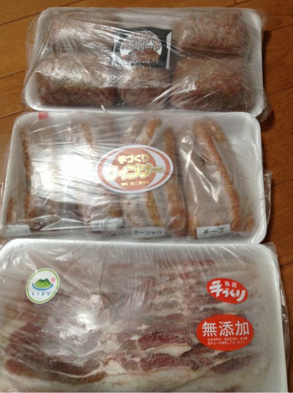 北海道森町の特製ハンバーグ・手作りウインナーソーセージ・手作りベーコンセット です。冷凍で届きました。北海道のヤマイチ佐々木精肉畜産さんで、ネット販売はしてないようです。でも電話で注文はできるかも。ただし、北海道なので送料は高そう。さとふるから申込んだので、時間指定出来ませんでした。さとふるはこちらです寄付日 3月25日寄附金額 10,000円。到着日 4月2日■内容量 ・特製ハンバーグ〔5個〕 ・手作りウインナーソーセージ〔500g〕 ・手作りベーコン(450g)レビューがとても良いので、楽しみです。ちなみにウインナーは5本ずつで、4種類。プレーン、チーズ、ガーリック、ギョージャにんにくです。ウインナー、食べました。ギョージャにんにくと、チーズです。ギョージャニンニクは朝食べたら臭いかな?と思ったけど、平気でした。それほどプリプリ感はないウインナーで、好き嫌いがあると思いますが、私はチーズ入りもぎょーじゃにんにくも、イマイチでした。家族も残してました。