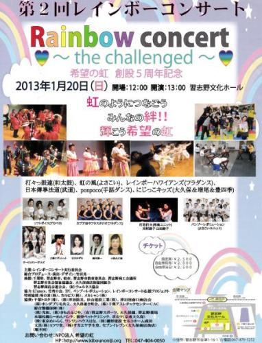 今回はコンサートの紹介です。 1月20日(日)習志野文化ホールで、知的障がい者を支援する施設『希望の虹』が 第2回「レインボ-コンサート」を開催します。ひとりでも多くの方の応援と参加を お待ちしています。 記 (第二回)レインボーコンサート 日 時:1月20日(日)開場12時 開演13時場 所:習志野文化ホール料 金:指定席2,500円 前売り自由席2,000円 当日自由席2,500円出 演: 《キャスト》 打々っ鼓連(和太鼓)、虹の風(よさこい)、レインボーハワイアンズ(フラダンス) 日本国拳法道(武道)、ponpoco(手話ダンス)、にじっこキッズ(大久保&増尾&豊四季) 《ゲスト》 打花打火(邦楽ユニット)月村路子&山田路子、バンブーレボリューション(よさこい) ソフトボイス(アカペラ)、カプア田中フラスタジオ(フラダンス)、 オービックシーガールズ(チアリーダー)、大庭エヴェレット(口笛)、立川かずさ(歌手) 鈴木淳一(和太鼓)主 催:レインボーコンサート実行委員会総合プロデュース:竹田光一後 援:千葉県、習志野市、習志野市教育員会、習志野商工会議所、 習志野市社会福祉協議会、大久保商店街共同組合、習志野商店会連合会、 大久保連合町会、(財)ウェルネス協会協 力:KTspace、竹宵の会、TPC、バンプーレボリューション特別協賛:味の素(株)、カルピス(株)、メルシャン(株)協 賛:千葉トヨタ(株)、(株)光和、杉山建設工業(株)、(株)きものふじや、 習志野スポーツ、大久保園、習志野薬局、本場札幌ラーメンパンケ、 新栄ペットクリニック、ボルツ(京成大久保)、(株)東京めいらく、 ワンワンハウスはな、(株)本田プリモ共立、セルコホーム成田[(株)鎌形建設]、 (株)千葉アスレチックセンター、津田沼南口商店会、文具(株)ミツワ堂、 (株)サカエヤ学生堂、セブンイレブン(大久保商店街三井住友銀行隣) (順不同)問合せ:NPO法人 希望の虹 047-404ー0050 --------------------------------------------------------------------------薬円台に、いち押しのカフェ「シンシア」オープン--------------------------------------------------------------------------「習志野防災かるた」が完成しました。--------------------------------------------------------------------------「わくわく習志野」リニューアル版をアップしました。--------------------------------------------------------------------------