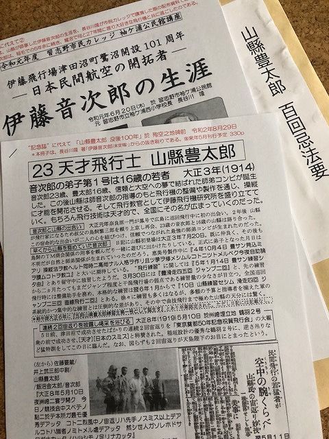 山縣飛行士が鷺沼台地に墜落死してからちょうど百年。複葉機での宙返りなど難度の高い飛行訓練をしていた最中の出来事、その頃、空を飛ぶことは命がけだったことが、配布された資料からもわかる。