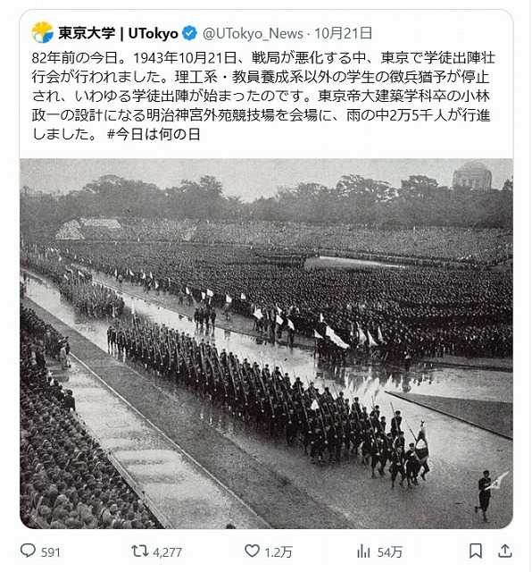 早朝に起きて、ペン字のネタを探そうとXを操作していたら、白黒の古い写真に出会って手が止まってしまった。82年前の10月21日、雨の明治神宮外苑競技場に2万5千人が行進した写真。生前、おじさんから飲んだ時に、よく当時のことを話に聞いたことがある。学業の途中で、この行進を行い戦地に赴き、たくさんの生命を落としていった。”今いる今日は、戦争で若い生命を落としていった人々がどうしても生きたかった明日だ” とはよく聞く言葉。タイミングよく、ラジオ深夜便終了の挨拶「二度とこない今日一日、大事に過ごしてください」と石澤アナウンサーの声が流れる。今朝はそんな写真を見て始まった。 生き方ブログ村注目記事 生き方ランキング(現在1位) クリック↓でいろいろな写真が見られます 日々の出来事ランキング暮らしを楽しむ Facebook Twitter instagram youtube --------------------------------------------------------------------習志野の風景 写真集--------------------------------------------------------------------ワンストップ習志野--------------------------------------------------------------------習志野ぶらり--------------------------------------------------------------------習志野ぶっくさろん--------------------------------------------------------------------習志野わくわくMAP--------------------------------------------------------------------「習志野防災かるた」が完成--------------------------------------------------------------------わくわく習志野(ツイッター)--------------------------------------------------------------------足で拾ったビジュアル習志野情報--------------------------------------------------------------------習志野の民話が形(本)になりました--------------------------------------------------------------------アクティブシニアネットワーク・習志野--------------------------------------------------------------------アクティブシニア市民講座(習志野)--------------------------------------------------------------------和太鼓 そでっ鼓連--------------------------------------------------------------------夢こむさ習志野--------------------------------------------------------------------