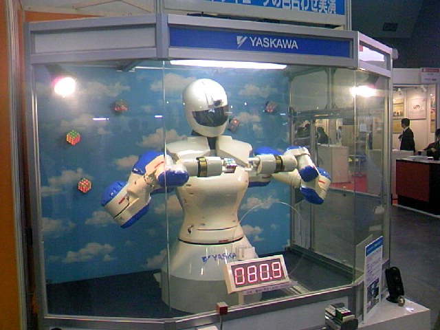 人より賢いロボット!。ルービックキューブを90秒で完成!。今日の午後、『ものづくりフェア2011』に行ってきたが、その中でも一際目立っていた。地元福岡が誇る産業用ロボットでは世界トップのYASKAWAのデモンストレーション。顔のカメラでルービックキューブの一つ一つコマの色と形を認識し、両手を交互に使ってクルクル回し、見事に完成。一体、どういうプログラムソフトを組んでいるのか?。制御のソフトならかなりのことが出来る我が社の社員も完全に脱帽。こんな緻密であり精密であるロボットを日本以外にどこの国が作ろうか。まだまだ世界に冠たる日本の技術。決して、捨てたものではありませんぞ!。がんばれニッポン!!!。(写真は展示説明員の承諾を得て載せています)クリックしていただけると励みになります!!!がんばれ東北!元気出せニッポン!「チーム無駄遣い10%」 会社のサイトです。こんな仕事をやっています。