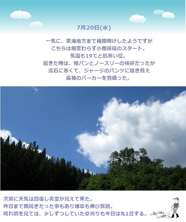 7月9日(土) 21℃(9:00AM) きのう久々にお日様が出て気温も上がったがきょうはまた雨になった。 夜中に足がつって何度も目が覚めた。それでも完全に目が冴えた訳じゃなく半分寝てる状態で寝返りを打ったり足の指を引っ張ったり、ベットの外に足を投げ出したりと・・・しまいには、ベットの淵に腰掛けたままの状態で寝ていた。いつものように5時前に起きる頃は、痛みはなく変わりなかったがあれは夢じゃない筈・・・ 【作業用BGM】 静かな森のハープ 起きた時はチリチリと雨。いつものように目覚めのコーヒーを頂き田圃の見回りへ。昨日の溝切り作業の疲れが足に出たんだと思う。何しろ連日の雨で大した仕事してない訳だし。急に重労働すりゃ足にも来る筈。 今日は、親父が老人クラブの日帰り旅行で出掛けカミさんと息子は弟の所へ散髪に行き、帰りに買い出しすると言う事でひとり取り残されてしまった。 外の雨の様子を伺いながらPCで組織のデータ作成。 その内雨も小降りになりデータ作りも嫌気がさしてきたのでツナギ着て外へ。 時間は11時前。親父がいないので牛舎へ行き牛たちに昼飯を。その後、暑い時よりはマシだと思い溝切り機を軽トラに積んで沢目の田圃へGO!どっちみち、家に帰ってもオイラひとりの昼飯になるので沢目の田圃を終わらしてから帰る事にし作業を開始。気温もそこそこ、小雨が体の火照りを沈めてくれる。 時間は午後2時ちょっと前、最後の1枚を終える頃一斉にカエルが泣き出し雨が強く降って来た。「今日は、この位にしておけ!」って、お天道様が言ってくれてるみたいに思えた。オイラ自身もこれ以上はちょっとしんどいと思っていただけになんか偶然にしては出来過ぎている感じがした。 軽トラに機械を積み、家に帰って降ろしたりしている内にずぶ濡れになってしまった。まだ、親父もカミさんたちも帰ってなくて自分で玄関の鍵を開ける。 このまま家の中に入る訳にはいかず玄関先で濡れたツナギなんかを脱ぎ捨てる。内に着ていたノースリーブのシャツが身体に張り付いて脱ぐのに苦労した。流石にパンツだけは玄関先ではNG(笑)茶の間に内干してる洗濯物から取り外し着替える。ちょっと引っかかるモノがあったが問題はないww 着替えが終わった頃カミさんたちも帰って来た。午後2時過ぎにやっと昼飯にありついた。その頃には、にわか雨も小降りになっていた。 自分の部屋へ行き、眠くなって横になったら夕方5時過ぎまで寝てた。 『そろそろはじまるよぉ~~』 カミさんの声で目が覚めた。 ”人生の楽園”見てくれましたか?地元が映るってなんか不思議な感じで出ている人もみんなおべだ(知ってる)ひとばりでかじょわり(恥ずかしいor照れ臭い)感じがしたwwテレビで見ると、実物よりちょっと老けて見えるのは何故^^元、職場の同僚もいたし、和牛組合の仲間も出ていた。母ちゃん方もみんなおべだひとばりwwこれを機に口コミで広がり繁盛してくれればと思います(^^)!明日は日曜だし、賑わうかもね^^ せば、今夜はこの辺で ご訪問ありがとうございました <(_ _*)> いつもありがとニャン🎵 案山子 熊本地震サポート情報