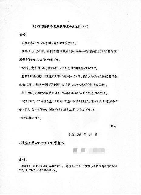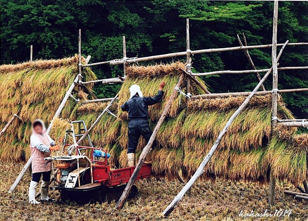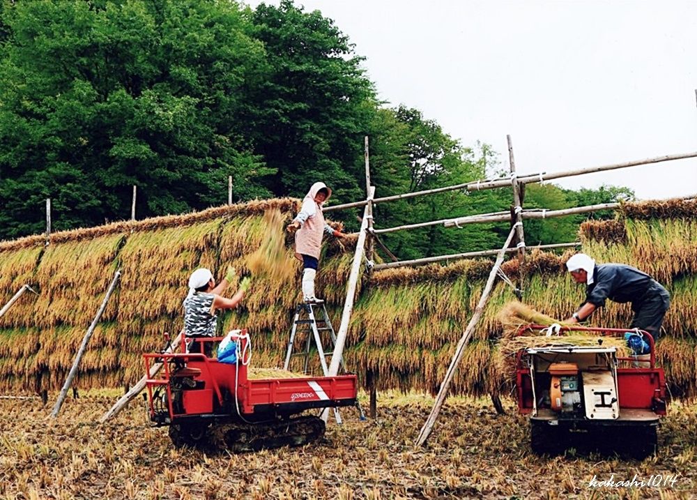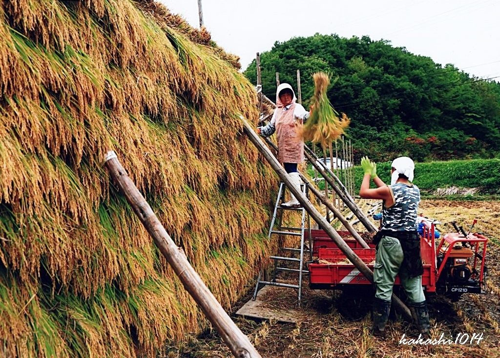どうも、秋の稲刈り時分に稲架掛けの様子を