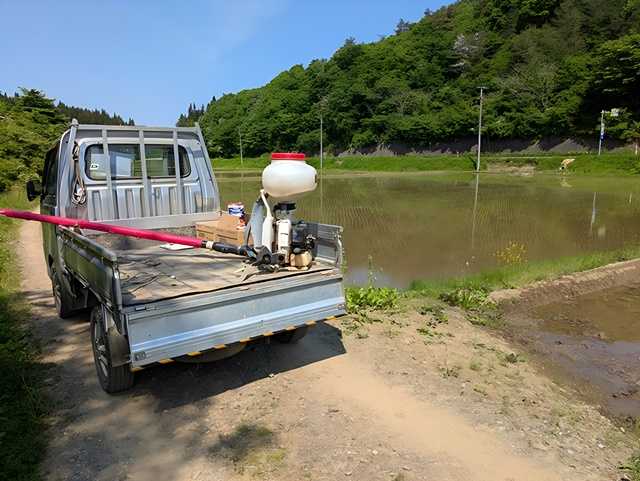 田植え後、重いこの動力散布機を背負って別々に散布する事になります。