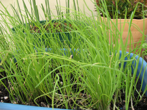 奥がコリアンダー畑。手前の白いプランターがフリージア。小さなプランターもコリアンダー。緑の小さなプランターはエシャロット。エシャロットは大きな鉢に植え替えました。