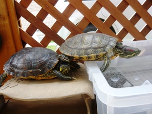 今朝も「暑い1日になるぞ~」と予感させる日差しでしたね。わたしが早い時間の勤務だったので亀たちも早くからウッドデッキに出て遊んでいました。どんちゃんは今日もごはんを無視していましたが落ち着いた頃にデラウエアをあげるとよろこんで食べますかめちもデラウエアは大好き。ふたりでぱくぱくとぶどうを食べている姿はけっこう不思議「暑くないの~?」意外に平気そうですが・・。どんちゃんがうれしそうにカメラ目線していますねてらかんが日よけ(よしずの小さいやつみたいなの)を買ってきてくれました。日陰の部分を多くしてあげようかなと思っています。