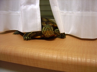 喜んじゃってカーテンに包まってうれしそう。飛び降りるかと気をつけていましたが