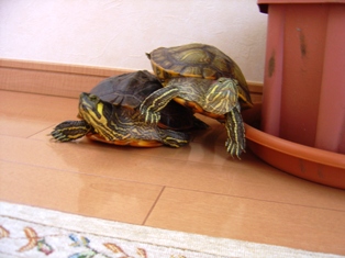 なんかがたごといってるなぁと思ったらどんちゃんがかめちの上に乗って