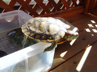 そしてブロックにつかまって後ろ足は水の中、甲羅だけ日光浴