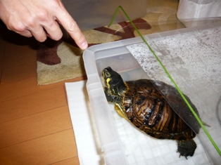 「おいしい~!もっとちょうだい」と指に向かって反応するかめち。
