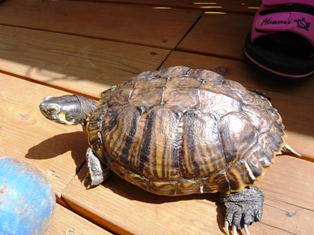 亀たちはのんびりと居眠りしながらウッドデッキで過ごしていましたよ