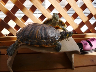 陸場も何箇所も作ったのにこの通り。ケースの水にどんちゃんが飛び込めば