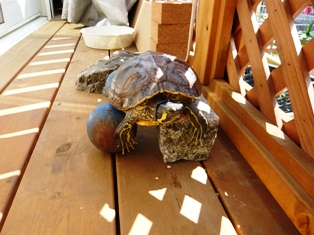 どんちゃんは今日も元気に動き回り、かめちが落ち着いて甲羅干ししている陸場へ