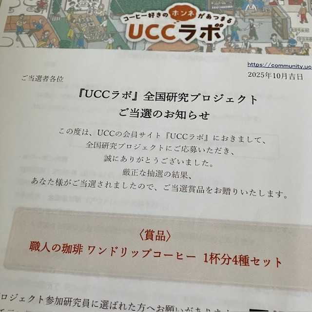 UCCのファンサイト「UCCラボ」から当選品が届きました!!コーヒー飲み比べの試供品4種です。コーヒー高けェェェ~と文句を言ったばかりなのに、ありがたいことです♪ワンドリップコーヒーってちょっと1杯だけ飲みたいときに便利ですよね。UCCの「職人の珈琲」にはコーヒークーポンもついているので(前はついていたけど、ゴールドスペシャルのクーポンも10点から5点になっていたし変わっているかも)コーヒークーポンについてはこちら ⇒ UCCのコーヒークーポンの景品届きました!好みの色のものを買おうと思います♪ UCCさん、ありがとうございました!!