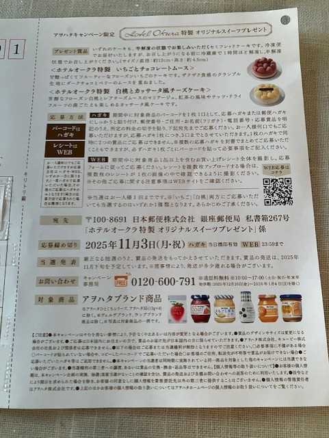 アヲハタの懸賞です。非常に美味しいホテルオークラのケーキが当たります♪