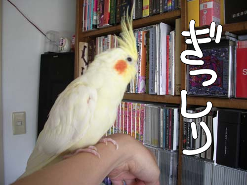 抜け毛じゃなくて、抜け羽ですね。頭の羽がぬけました~かめは、自分の抜けた羽がきらいです。羽繕いしていて抜けると、その場からあとずさったりします。自分の抜け羽が怖いのでしょうか。首の角度と目がこわい・・・羽繕いに疲れたら、人間に続きをやらせようと手にはまるかめちゃん。当然、という顔してますね~人間、しもべだから仕方ないか・・・