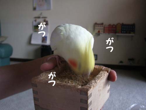 塩土が怖いかめちゃん。慣れてもらうために、ボレー粉をのせてみました。食べました、単純ですね~塩土はかじらないけど、これが第一歩です。がんばれ、かめちゃん!今度はイカの甲にボレー粉をのせてみよう。今日はことぼうも紹介しましょう。私ことぼうではなく、オカメインコのことぼうです。3年前に17歳で亡くなったことぼうです。この写真は死んでしまう数日前に撮ったものです。こうして見ると、おばあちゃんですね。17年も一緒にいたのが、突然いなくなるのってつらいものでした。本によると、17歳は平均寿命のようですが長寿なものは25~30歳まで生きるそうです。かめちゃんには健康でがんばってもらわねば!長生きするように、「かめ」ってつけたんだから。