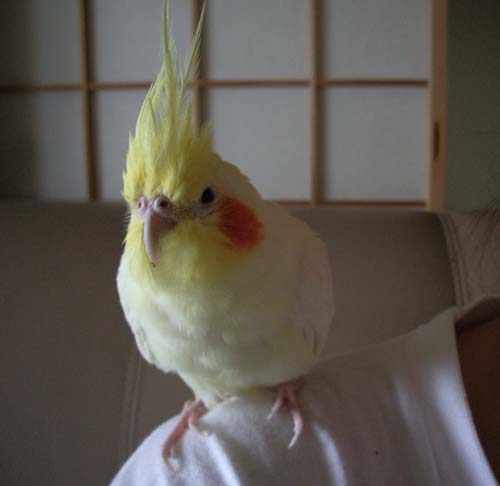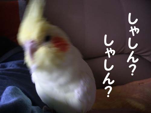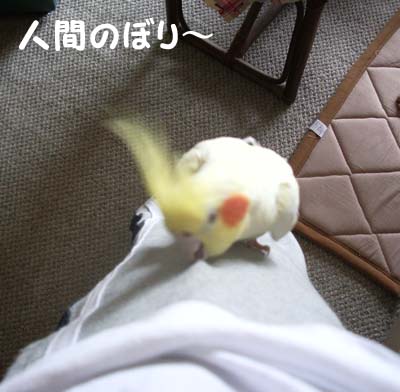 オカメインコって時々飛べるのを忘れるようです。飛べばすぐなのに、苦労してカゴからおりて走ってきて人間のぼりをはじめます。そして、なぜか途中でさかさまに。かめはなにかというと、さかさまになります。カゴでも、カーテンでも、肩でも。目でうったえるな~!何でも言うこと聞いてしまうじゃないか~