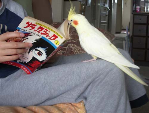 かめちゃんのむずむずはまだまだ続くのです。換羽の時期は羽繕いばかりで忙しそう。肩にいても、ごはん食べてても、遊んでいてもすぐ、むずむず。頭をかいてやると、羽がぼそぼそ抜けてちょっと怖いくらいです。まんじゅうというか、スポンジというか、なんだかおいしそう。カスタードクリームが入ってそうです。羽が抜けた後は、新しい羽がカラにはいってニョキニョキはえてきます。私はそれをほぐすのが大好きです。ああ・・・たのしみ。