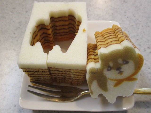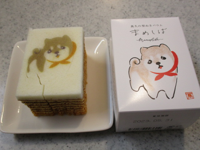 焼き重ねた「黄な粉のバウム」。かわいいまめしばの絵柄と切り抜きを施した、