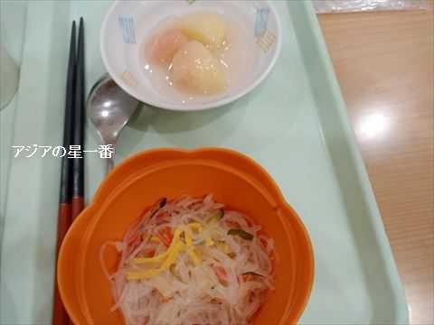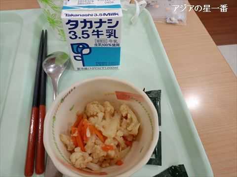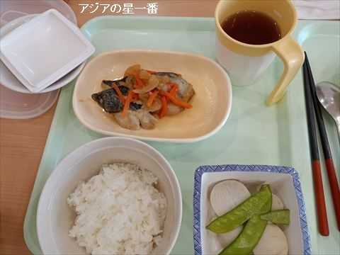 昼食です。ご飯に煮魚、芋と豆、そしてお茶です。