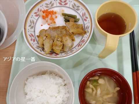 夕食です。ご飯に味噌汁、チキンのフライ、そしてお茶です。