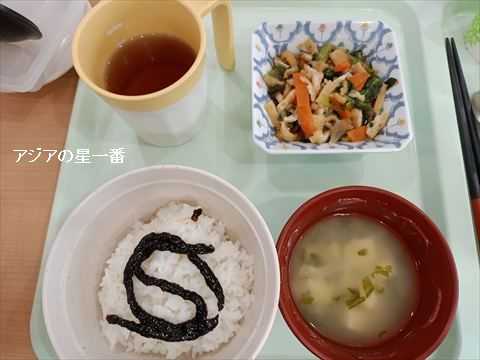 朝食です。ノリご飯、味噌汁、アブラゲ野菜、お茶です。