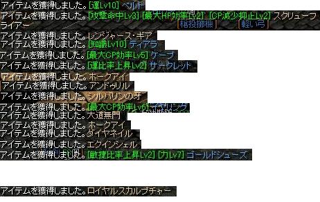 おはようございます。 いやー、昨日最後のレポートを提出したので今日から夏休みです。しかしバイトや集中講義、元彼女さんや友達からの呼び出しで授業期間中よりも忙しくなりそうですorz 呼び出されてばっかりはなんか負けた気分になるので一応好きな子にデートのお誘いをいれておきました^-^そしたらさっきOK来たヽ(●´∀`●)ノやっほーい さて、RSのお話まずはここ数日のドロップ紹介 試験期間だったので数は少ないですがwロイヤルスカルプチャーは鈍器なので一瞬エサにしようと思いましたが、性能を見るとなかなかいい感じだったのでいそめさんに相談して3億置きで耳待ちしていたところ、 先ほど2億でアプローチがあったのでその方に買って頂きましたヽ(●´∀`●)ノスクリューもさりげなく10Mで売れたっていうw速度SF買わない人にはなかなかいいのかも知れませんねw レベルの方は現在剣士が497レベル、シーフが414レベル、テイマが422レベルです。剣士の上がり方はずっと変わらずですが、地下界に通い始めた途端にテイマとシーフの狩りをしっかりするようになりましたねwなんて分かりやすい性格なんだ私wそんなテイマとシーフも地下界の性向が80になりました。ロイヤルも売れて10億Gもなんとか確保出来たので@2回通って次で鏡だヽ(●´∀`●)ノこれで2回とも失敗したら涙目wwww そして昨日、狩場が埋まっててあまりに暇だったのでミズナ探検してみたんですが・・・ なんかチャーミングなやつがいた カバンにイッパイあった青も減らしたかったので挑戦することにヽ(●´∀`●)ノ ひぃwwww汁wwwww汁wwwww 何か落とすのかと思ったけど防御速度の手だけでした(´・ω・`) まぁこんな感じでちょいちょいやってますヽ(●´∀`●)ノそれでは今日はこの辺で( ゚д゚)ノシ ε=ε=┏( ・_・)┛