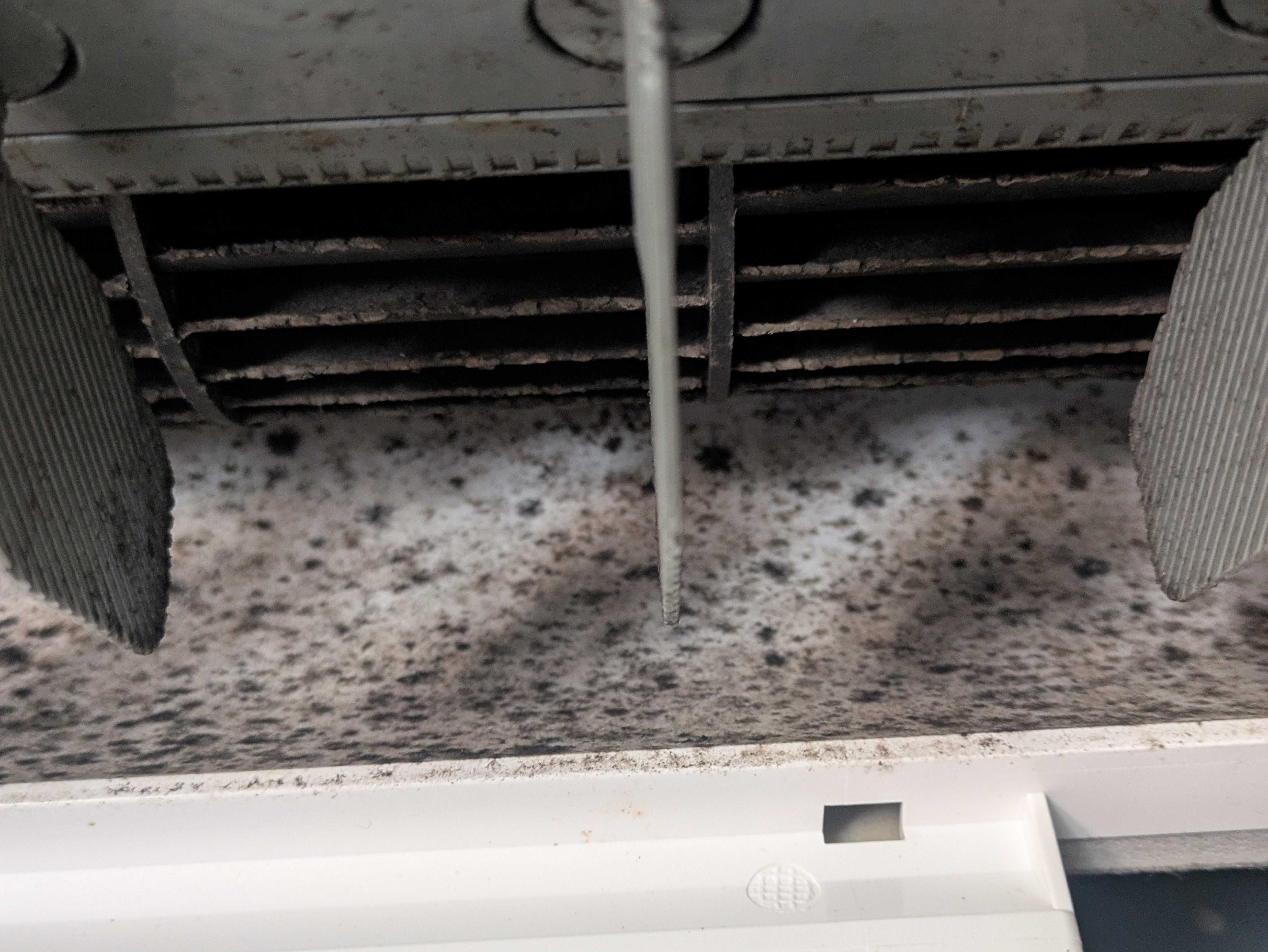 エアコン分解クリーニングしても、何回洗浄しても、エアコンからの風が生臭いときがあります。業者さんの方でも、悩むときはあります・・・今回は、原因の一つをお知らせいたします。それは・・・エアコンの機種によって、内部の構造にて、ある部品が原因と思われます。お客様より、2社の業者さんにクリーニングしていただいたけど、どうしても雑巾の生乾きのような匂いがして困っていると相談をいただきました。エアコンの外装パネルを取り外してみると、特に洗浄残しがあるとは思えないぐらい奇麗にクリーニングされておりました。エアコンの構造部品をチェックしていくと、原因と思われる箇所が3点見つかりました。まず、エアコンのアルミフィンに取り付けられている、プラスチック製の細いバーがありました。簡単に取れるものですが、外してみると・・・裏側にはカビが確認されました。アルミフィンのつなぎ目に補填されている物です。とりあえず、外して洗いました。さらに・・・アルミフィンと、ドレンパンの水受け皿の隙間には、黒い吸水スポンジが取り付けられておりました。このドレンパンの隙間に、タオルを差し込み、タオルで臭いを確認したところ・・・・どうやら、スポンジが吸い込んでいる水が、臭いの原因のようでした。ここは、ブラシしてもスポンジの消臭は完全に取れないため、とりあえず「次亜塩酸ナトリウム水溶液」(逆性石鹸を希釈して)ゆっくりと流してみること、10分程様子を見ました。そして、十分な水で洗浄してみると、臭いがなくなりました。そして、アルミフィンの上部には、白いプラスチック製のバーがありました。そうです!!この白いバーの裏側にも、吸水スポンジが取り付けられておりました。このスポンジ部分にも、洗剤を塗り10分放置してみて、流水洗浄して元に戻してみました。起動確認してみると、見事、嫌な臭いが消えました!!お客様にも確認していただくと、全くなくなり、大満足のご様子でした。私たちも、エアコンクリーニングを15年以上施工しておりますが、今回の機種は驚かされることとなりました。エアコンクリーニングを施工される業者様には、今回の記事は、是非とも今後の参考にしていただけたら幸いでございます。今年の夏は、猛暑でエアコンクリーニングを依頼されるお客様が増えると思いますので、お互い頑張りましょう!!神奈川ハウスクリーニングセンター代表 木村健二