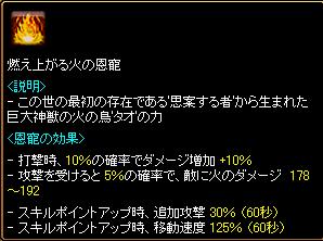 みなさんこんにちはー(’’さっそくですが皆さんはもう新クエストの数々はお試しになったでしょうか?私ブランも少しですが、体験してきました!!今回の目玉クエと言えばこちら↓↓↓そう 「恩寵クエ」 ですね(’’前回の日記で「前々からステータスにもあるから~なんたら~」って書きましたがあれはウソ八百ですwなにを思ったかあのときは恩寵クエを「善悪値」に関係あることだと勘違いしていました。。。。なにわともあれ実装された恩寵ですが、少し前まで私は 「大地の恩寵」を使っていました。初めは「別になんでもいいかなぁ」程度だったので特に考えもせずギルマスの悲哀さんとかとクエを受けてとったのですが、その後話しによると姫には「火の恩寵」が効果的との話しを聞いたため、火に変更しました。火に変更するときに手伝ってくれたギルメンのマスコさんとカオリさんにこの場を借りて、お礼申し上げます(’’*-----------------------------------------------------------------さてさてこの恩寵ですが、なかなかおもしろいですね。。適正狩り場だとほとんど恩寵の効果をずっと受けた状態で狩りができるみたいですね。。。(’’*。。。ほぼずっと 移動速度+125%とその他の効果 はかなりおいしいですね。ただその分いろいろな問題も多いみたいですが。。まず、その他の支援系スキルと上書き関係になってしまうと言うことですね。。。良く言われるのが、風の恩寵の被ダメ時移動速度UPがWIZのヘイストの移動速度上昇効果を上書きしてしますというのを聞きます。。その他にも、大地の恩寵の「防御力-10%(実際は100%らしいです)」がネクロの悪態 や リトルのウルトラノヴァ の低下効果を上書きしてしまうらしいです。これは、複数の的をドンドン倒していく狩り場ならさして問題ないのですが、コロッサスやリッチみたいに1体をPTで倒していく狩り場だとちょっと困りそうですね。。まぁリトルのノヴァは基本的に魔法抵抗低下がメインなので問題ないですが。。ちなみにネクロの悪態で防御力低下が100%を超えるスキルLVであってもどうやら上書きされてしまうみたいです。大地の恩寵の「防御力-100%」は単純に「-100%」ってわけではないのかもしれませんね。。(まぁ頭良くないので詳しいことや計算式やらはよく分かりませんが。。w)まぁ早い話がどれももう一度かけ直せばいい話なのですが。。あと他にも風の恩寵のスタン効果ですが、「打撃時」とありますが、どうやら「敵のターゲットをとるスキル」なら何でも発動する確率があるみたいです。つまり実際にはダメージを与えない姫のCP溜めスキルの「おしゃべり」とかでも発動するみたいですね。とまぁ実装されて間もないですが、色々まだ分かって無いことが結構ありそうですね。。水とか火の恩寵についてもこれから「実は・・・」なんてことがあるかも。。。まぁなにわともあれ情報が出てくるまで待ちですね。かと言ってもう変える気はないかなぁ。。。(ぁ---------------------------------------------------------------【最近のブラン】現在173です。マスコさん追いついちゃうよ~(ぁ---------------------------------------------------------------【その他】この他にも記事にしたいことが山ほどあったのですが、なんだかタイミングがずれてしまったので。。。。「日記にします~」とか言ってしなかったのも。。。やっぱりネタが入ったらすぐ書かないとだめですね。。反省します。。(’’;あと何か書き忘れている気がするのですが、今日はこの辺で。。See You Again!!!(’’ノ