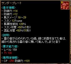 みなさんこんにちはー(’’最近パソコンの調子がおかしくて困ってます。原因がわからない。。。(’’; あと12月に入ったので背景画像をクリスマスっぽく変えて見ました。 (`・ω・´)クリスマスカラーと言えば赤と緑ですしね。最近のRED STONEですが、最近あまり時間がとれずIN率が結構減ってます。まぁ年末なのでしかたがないですが。。でも昨日は時間があったのでひさびさに狩り狩り。。先日の日記でも書いたように、サンダープレートを安く購入できたので、せっかくなので使ってみました。予想はしていましたが、混乱とスタンが良く効いてなんとも使いやすいですね(’’ここは河口ダンジョン(ド)なのですが、太った方相手にはほぼ確実に混乱していました。ただ残念だったのはゴーストにはきかなかったことですかね。それでも被ダメがかなり減るのでPOTの節約にはなりました。。(’’そして狩ること数分。。Lvアップしました。(`・ω・)b敵が混乱するとスキルがキャンセルされないので安心してノヴァとかを撃てたのもかなり良い点でしたね。やっぱり良い装備はそれ相応の値段がするんですね。。。。(’’(これは安かったけど。。)---------------------------------------------------------------------------【本日の小ネタ】自分で自分のブログの1111番目の閲覧者になりました。ゾロ目で嬉しいような自分で踏んで悲しいような。(´・ω・)・・・・・・・また~(’’ノシ