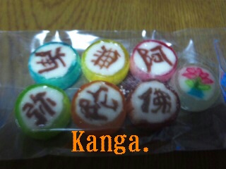 今日は主人の祖母の法事がありました。お寺でお経をあげてもらい、その後和尚さんを交えてお茶とお菓子をいただきました。今回子供さんにと出されたお菓子に、「おねんぶつ飴」というものがありお土産に頂きました。帰宅してなかを開けると『南無阿弥陀仏』と書かれた金太郎飴が。こんなものもあるんですね。早速いただきました。ひとつひとつの味が違っておいしかったです。ほかの金太郎飴となんら変わらないのでしょうが、なんだかありがたい気持ちになりました。金太郎飴本店『おねんぶつ飴』
