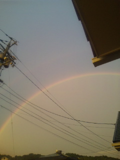 夕方18時ごろ窓の外が赤くなっていたので、玄関に出てみた。真っ赤な夕焼け空になっていて、右を見ると大きな虹ができていたので急いで携帯で撮影。よく見ると虹のそばにもう一つの虹が。台風の強風域が近づいているころだったので、台風の影響かな。