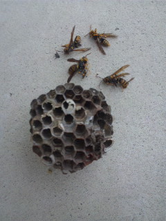 仕事から帰ってきた旦那様に話し、高い位置にあるから大丈夫では?という事になった。しかし、近所に住む義親に話したら殺虫剤で簡単に駆除できると言われ、やっぱり駆除することになった。(蜂くん、ごめん)いろいろネットで調べ、夜に行う方がいいというので、ドラッグストアで蜂専用の殺虫剤を購入。説明書きに巣には3m近づいてとあるので、窓から噴射。懐中電灯で照らして駆除剤をまいたが届いたか不明。しばらくして外へ出ると3匹落下していた。今度はいろんな害虫に効く殺虫剤をかけて殺した。巣は明日撤去予定。全滅していてくれればいいのだけれど・・・・。