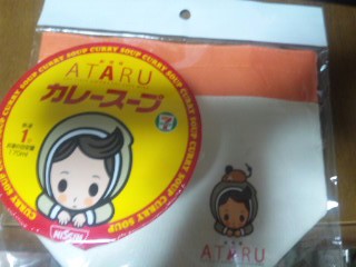 対象商品を購入し、ATARUコラボ商品をもらいました。ATARUカレースープとATARUトートバッグです。カレースープには似顔絵入りのかまぼこが入っていました。味は薄いカレーヌードルのスープ?ルー坊は、チョコザイのまねをしながら喜んで食べてました。トートバッグは、なかなかしっかりしてよさそうなつくり(未開封だけど)でしたが、イラストが転写ぽいので、気をつけないとはがれてしまいそう・・・。