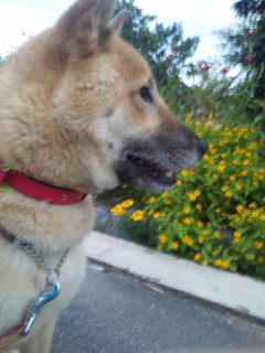 我が家のワンコが3歳になりました。写真が嫌いですぐにそっぽを向いてしまいます。子犬の頃からの口の周りの黒い毛、いつになったら白くなるのかと思っているけど・・・。散歩途中の花壇にて。