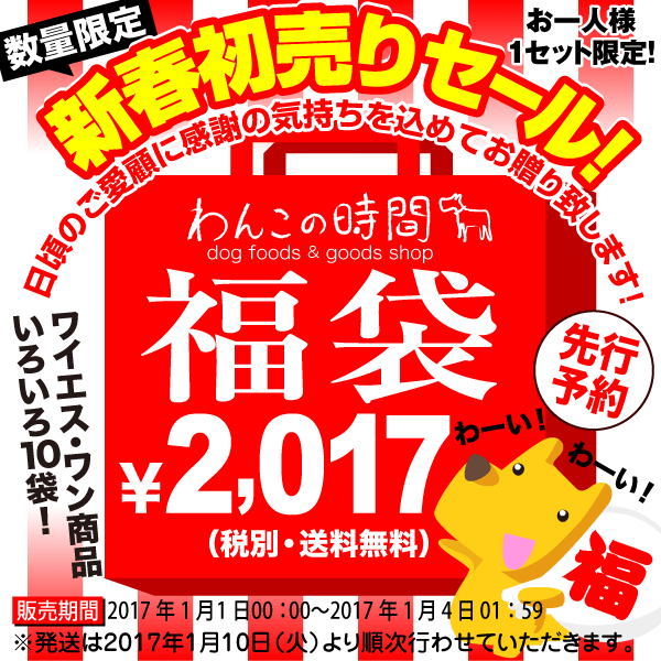 ■商品名:★新春初売りセール★『新春福袋2017』2,017円(税別)【送料無料】2017年1月1日(元日)00時00分予約スタート! ※ワイエス・ワン商品10袋 【ご予約1/10(火)より順次発送】※こちらの商品はお届けまでにお時間がかかる場合がございます。■レビュアー:カンガママ ※投稿時■レビュー内容毎年楽しみに購入しています。今回の内容は、おばあちゃんの鶏ササミ、職人が仕上げたとりササミ(にんじん)、チップストーリー(チーズ、砂肝)、デリシャスデュオプレミア(馬肉)、そざいがちからささみチップス(馬肉)、やわらかい砂肝ソフト、ライスデンタルスティック(プレーン)、発芽玄米鶏もも、ライフプロ豚耳スライスソフトの10点でした。賞味期限は短いもので2017年11月21日、長いものは2017年12月28日でした。