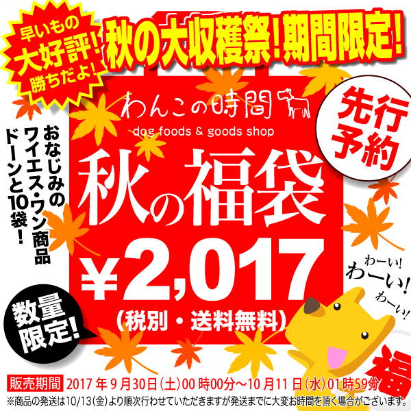 ■商品名:★秋の大収穫祭★『秋の福袋2017』2,017円(税別)【送料無料】2017年9月30日(土)00時00分予約スタート! ※ワイエス・ワン商品10袋 【ご予約☆順次発送】※セール期間中、直前直後のご注文はお届けまでに大変お時間がかかります。【お一人様1セット限り】 ■レビュアー:カンガママ ※投稿時■レビュー内容今回は、ワンコの誕生日プレゼントとして購入。内容は、おばあちゃんのとりササミ(巻きリング、ジャーキー)、デリシャスデュオプレミア(フィッシュ、ライスガムさつまいも)、ライフプロ馬肉、チップストーリー鶏ササミチップ(砂肝、緑黄色野菜)、素材がちから(しっとりりんごササミ巻き、ささみチップスレバー)、デリシャスデュオライスデンタルスティックシニアでした。賞味期限は短いもので2018年7月30日まで、長いものは2018年9月26日まででした。
