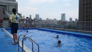 青山子どもの城の屋上プールです♪奥に見えるはミッドタウン・六本木ヒルズ♪いろいろな国の子どもたちが泳いでいました~このプール♪せっかく東京きたのに。。プールに入りたいって。。ミキ。。まー暑かったからね。。雷が突然なりだして~。。ほとんど子どもたちプールから上がったのに。。ミキを含めて数人のんびり泳いでますね。。ちなみにプールは別料金でした。。で。。小学生になって初めての夏休み♪東京でミキの発達クリニック診察がありました♪診察と言っても子ども用キッチンを併設したキッチンクリニックです。実際本物の子ども用に作られたキッチンを利用して発達障害児に料理をしてもらうと言うクリニックです♪ユニークだと思いませんか~。遊び?って感じもしますが。親としては6歳のミキがどこまで親・ドクターの指示を聞いて何処まで実際に料理ができるか。真剣でした♪キッチンクリニックの内容は後日。。で午後2時からの予約だったので午前はミキのリクエストで青山子どもの城へ遊びにいきました♪前日からブログでお世話になっている”ぼたさん”と前夜待ち合わせのやり取りをして♪当日スタンプタリー中だった♪ぼたさん・てっちゃんと青山子どもの城でお会いすることができました♪てっちゃんとミキ♪ビビビ!ときたのでしょうか♪この二人初めてあったのに~いきなり手をつないで自己紹介をお互いにしていました♪そのあと遊ぼう~って♪二人で遊具施設に入っていって追いかけっこしたり♪あ~ミキが同年代の男の子と仲良く遊ぶ姿に感動(涙)でした♪ほんと~優しい男の子ってかっこいいですね♪てっちゃん♪ジュースも二人で仲良くのんでね~♪(涙)ミキ♪てっちゃんと遊べてとっても楽しかったって言ってました♪数時間でしたが有意義なオフ会?でした♪波長が合うのでしょうか♪また~ぼたさん遊んでくださいね~♪