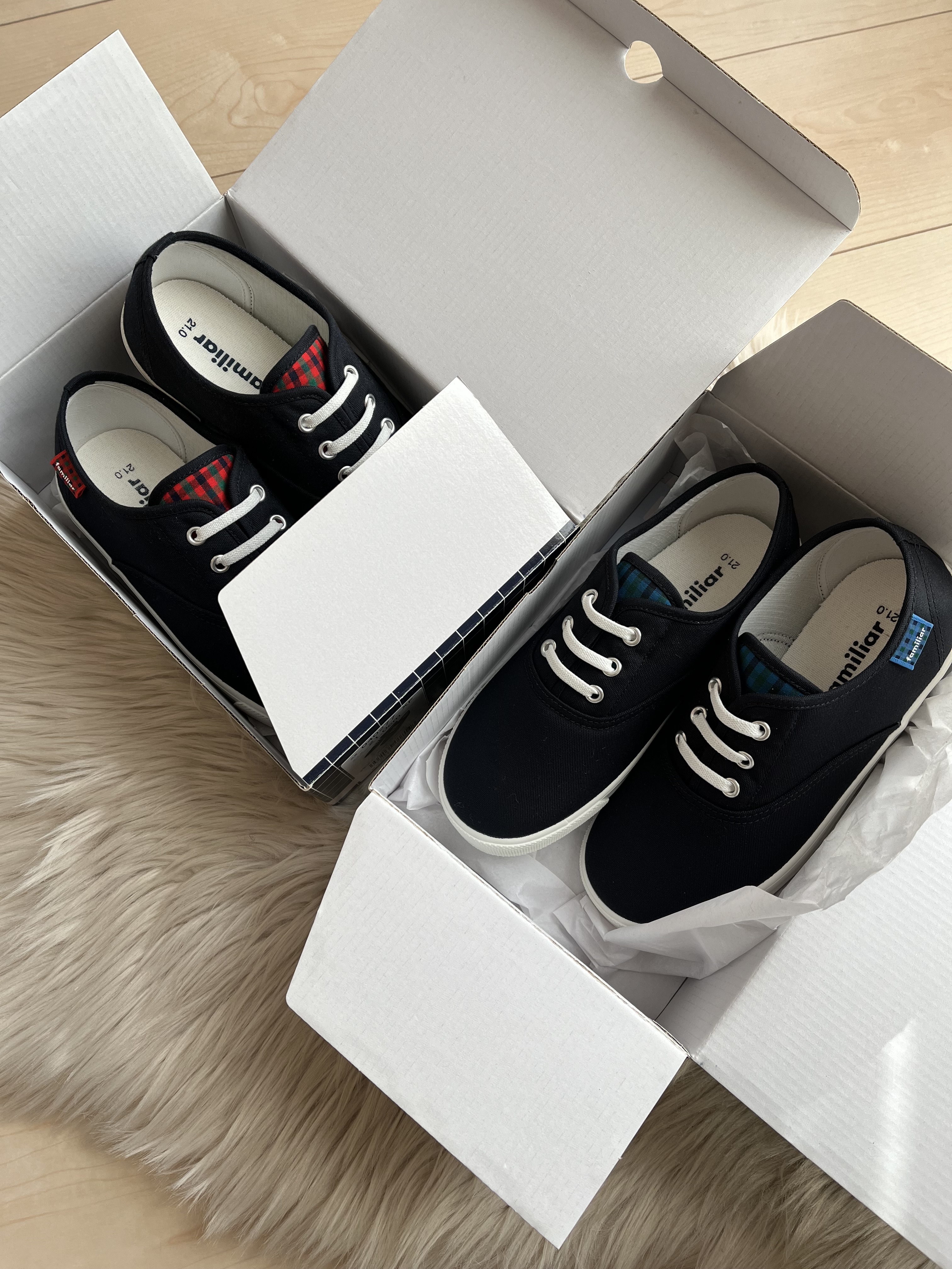 青チェックスリッポンを初おろし、
