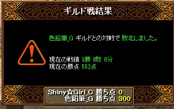 シャイニーにて100制限GV!お相手は色鉛筆様参加転送終了ギリギリのとこでgoyouさんがきてくれてWIZ3になり参加が剣士3リトル2BIS2術士1武道1ランサ1だったなかなかのバランス!場所がエルベルク岩の谷だったんで抵抗がかなりさがってお互いにTUで混乱しまくりだった^^;特に術士の魂がきまったときは相手もこちらもきつかったみたい><;んで結果ー・・・とりわすれた^-^初めてな気がするwたしか900-400?くらいで勝利とってとられてで楽しかったなーまたしたい!対戦ありがとうございましたー