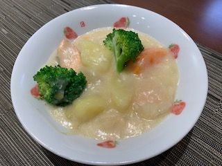 材料はスインレスサーモン、玉ねぎ、人参、じゃがいも,ブロッコリー