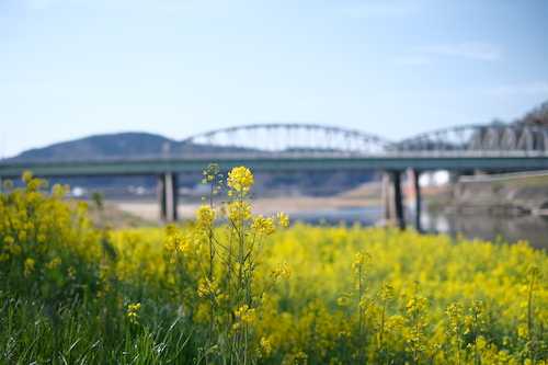 河川敷に群生している菜の花、普段っぽいお散歩風景にしてみました