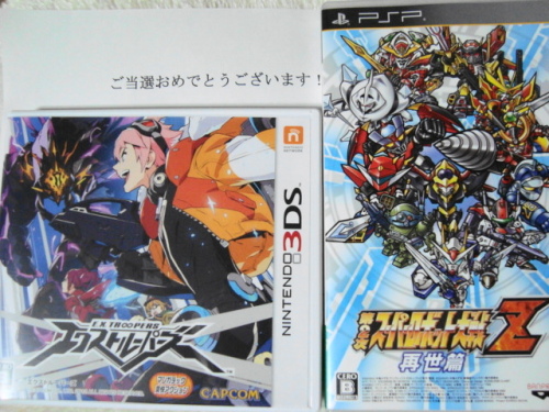 ゲームソフトが当たっても、ゲーム機本体がないと、当然ながら遊ぶことはできません。当たって嬉しいはずなんだけど、遊べないむなしさ。え?本体持ってないのに何でソフトのプレゼントに応募してんの?いやいやいや・・もう『当てる』『応募する』こと自体が、ゲームみたいになってることもありますが。もしかしたら明日、本体が当たって送って来るかもしれませんからね、それに備えてソフトプレゼントも見つけたら機種を問わず応募するようにしています。そう簡単に本体が当たるわけはなく、PS3やXBOXのソフトだけ当たってさびしく鎮座・・。なんてことが何度もありました。しかし!昨年末に ようやく3DS本体当選しましたので3DSソフトが当たっても! 思いっきり遊び倒すことができるようになりました!はい、3DSソフト初当たり!カプコンのアクションゲーム『エクストルーパーズ』です。スパロボはまたまたオクで落札。春はやっぱりロボ祭り!メール便送料無料 新品 3DS エクストルーパーズ価格:2,480円(税込、送料別)現時点で送料込みで楽天最安店はこちら あら?昨年11月に発売されたんですが、新品でも半額になっちゃってますけど・・・えーと、そんなに悪くないですよ?イベントシーンは漫画のコマ割みたいに進んでいきます。3Dだと擬音がゴオオオオオと飛び出しますね。最初は・・・楽しいです。でも戦闘シーンになると目が痛いので3D機能切っちゃいますけど。アクションは難易度低目。アクションゲームあまり触らない人でも何度かやっているうちに慣れてくると思います。モンスターハンターを簡単にしたよーな?戦闘⇒敵ごとに落とすアイテムが違う⇒アイテムを集めて武器を強化するって流れで。モンハンは途中でメンドクなってやめたんですけど、これはかなりシンプルな作りでストーリーがどんどん進むんで釣られてやっちゃいますね。かなりゆったりプレイして20時間くらいでエンディング。クリア後はさらなる強敵、新しい武器などやりこみできるようになっていますが・・・うん、もういいかな。話は学園ロボットモノ的な。Bungee Price Blu-ray【送料無料】 STAR DRIVER 輝きのタクト Blu-ray BOX 【完全生産限定版】 ...価格:27,888円(税込、送料込)銀河美少年を思い出すんだけど。てっきりこのアニメとスタッフ同じ?と思うほど設定は深そうに見えますが、実は余り考えてないでしょ的な軽めのシナリオ・・・なんかよくわからんうちに倒してた・・・・一体ナニがしたかったんだラスボスは・・・仲間になるキャラもたくさん出てくるんですが、それぞれのイベントがあっさりしすぎていていまひとつ魅力が発揮できてないような。声優に頼りすぎ~~。決してつまらなくはないのです。面白いかと言われれば面白いのですが・・積極的に遊びたいか?と言われれば・・初心者でも最後までストーリーを楽しめるような親切さはいいんですが、全体的に薄味になっちゃたような。対戦プレイだと化けるのかもしれないけど、3DS版はオンライン対戦できず、本体持ち寄りだから・・。でも新品2000円くらいなら、アニメ好きな方、モンハンに興味歩けど敷居高そうなんでって方への入門編にはいいんじゃないかな?ま、ワタシは当たったんでハガキ代50円しか使ってませんけど!?(3万円分のはがきでどれくらい当てることができるかプロジェクト・・・現在9700円分獲得)さあ、次はいつソフトが当たってもいいようにPS3 Vita WiiU XBOX360 本体当てなきゃなあ。。。