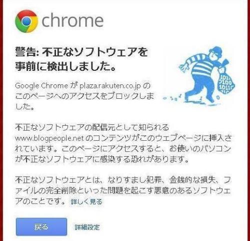 熊本で大気汚染粒子PM2.5が健康に害を与えるレベルになるかも、外出を控えなさいと全国で初めて注意喚起が出されて・・今日の日記はこれをテーマにしようかと思ってたんですけど、それより衝撃の事件が発生したので予定変更です!今朝、いつも通り自分のブログにアクセスしようとしたらはあああああああああ!??えーと・・・ワタシのブログってそんな危険だったのか!?・・いやいやいやいや。ちょっと待ってくれよ。どーいうことですか、これは!?まさかウイルスとか感染してるんじゃないでしょうね!?このイラストの泥簿、怪しすぎ!!で、まったく表示できません。Google Chromeを使ってのアクセス。IEでも、グーグル検索から来た場合には遮断されました・・。自分のブログなのに・・・【送料無料】Google Chrome完全活用術 [ 田口和裕 ]価格:1,029円(税込、送料込)動作が軽いから気に入ってるんだけどGoogle Chrome・・・もし見たいサイトや、自分のブログがブロックされた場合に、どーしても見たいなら上画像「戻る」の横の詳細設定をクリックすると「自己責任でお願いします」ってメッセージが出てアクセスできるようになります。ただ、本当に危険な場合もありますのでお気をつけください原因は「blogpeople」のコンテンツが挿入されているからと。どうやらグーグルがBlogpeopeを危険なサイトとして認定、で、そのリンクバナーを貼っているブログも一律にアクセスできなくしちゃったらしいのです。うーん。Blogpeopleってのはブログの人気ランキングサイトの一つで、特に危なくないと思うんですけど・・まあ、1年ぐらい前から放置しっぱなしだったんですけど。とりあえず、バナーを剥がすか。2012年の楽天ブログ仕様変更でトップページサイド欄に1つ貼り付けておけば自動的に全日記ページに表示されるようになったので、ここに貼っていたバナーを削除すれば・・ああ!今度はちゃんとアクセスできます。ただ問題は・・・2010~2011年の日記にはほぼ毎日、貼ってあるので・・・これ一つ一つ削除していくのは・・・とてつもない時間がかかる!!試しに1ヶ月・・・あーー20分もかかるよ。2年分消すには・・もう計算もできねえぇ!でも、もし検索からこのブログにきて「このブログは危険です」なんて表示が出たら、もう2度と訪問してくれないだろう・・被害は最小限にとどめたい・・まずは、Blogpeopleに問い合わせ。すると・・なんと他の大手サイトでも同様の事態が発生しているとのこと。「毎日jp」など「不正なソフトウェアが存在する可能性」でGoogleからブロック(Yahoo!ニュース)毎日新聞にオリコンも!?以前にもU-STREEMやニコニコ動画などがブロックされたってことも。どうやら、配信されている広告に問題があると、機械的に自動判定されているようですが・・。しかし・・まさかワタシのブログまで巻き込まれてしまうとは・・・予想外。で、仕方ないから空き時間にバナーを削っていってたんですけど・・・夕方6時過ぎに規制解除されたって連絡が。恐る恐るバナーがまだ貼ってある日記にアクセスすると・・おお、ちゃんと表示された!ひとまず解決か・・!?はーー、バナー削除のために余計な時間を使ってしまって予定がぐーーーぐるう 予定が狂う・・・っちまったじゃないか!