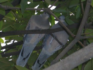 社殿に向かう途中で「デーデーポポー」と特有の鳴声が聞こえたので、探してみるといました。私は「山鳩」と言っていましたが、正式には「キジバト」と言われる鳩です。境内の木にとまっていました。みつけた時は一羽でしたが、カメラを用意しようと社務所に帰って見ると二羽のつがいでいました。キジバトは大体つがいでいるそうです。境内でみつけた、つがいのキジバトの写真境内のこの木にとまっていました。たまに榊の実を食べに来ているようです。以前、ご紹介した「メジロ」も榊の実を目当てにして来ている様子。新橋の駅前でも、木があると、こんなに自然が感じられます。改めて木や森の大切さを実感致します。