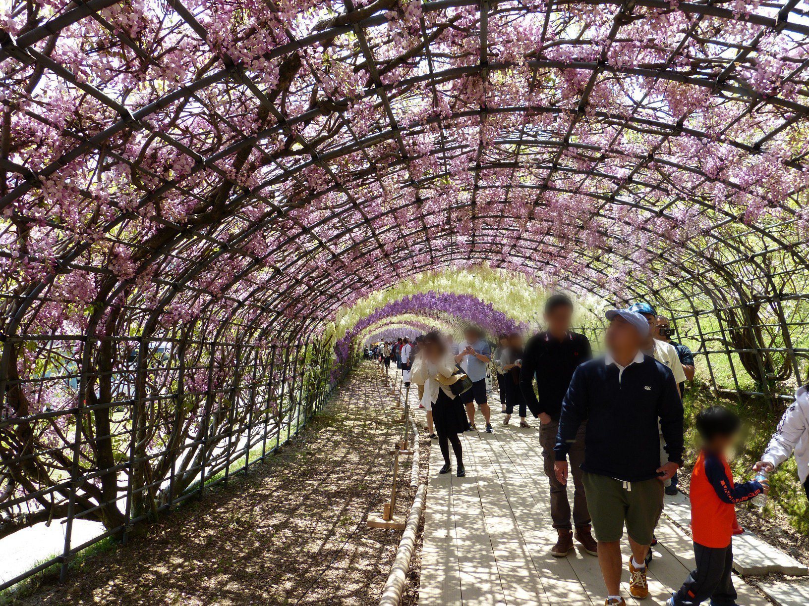 福岡県の河内藤園に行くツアーに参加した時の写真です。今はどういうシステムになっているかわかりませんが、この頃は団体予約か、個人はローチケを使った事前予約制だったはず。藤園に向かう道がすれ違いすら出来ない狭い道なので混雑防止のためとか。私は旅行会社のバスツアーで行きました。確か、案外、中国人の観光客が多かった記憶。事前予約制で入場制限するくらいの人気なので、人が入らないように写真を撮るのは難しい。今まで見た中では圧倒的に藤の規模も大きく綺麗でしたよ。特に藤のトンネルは素敵でした。