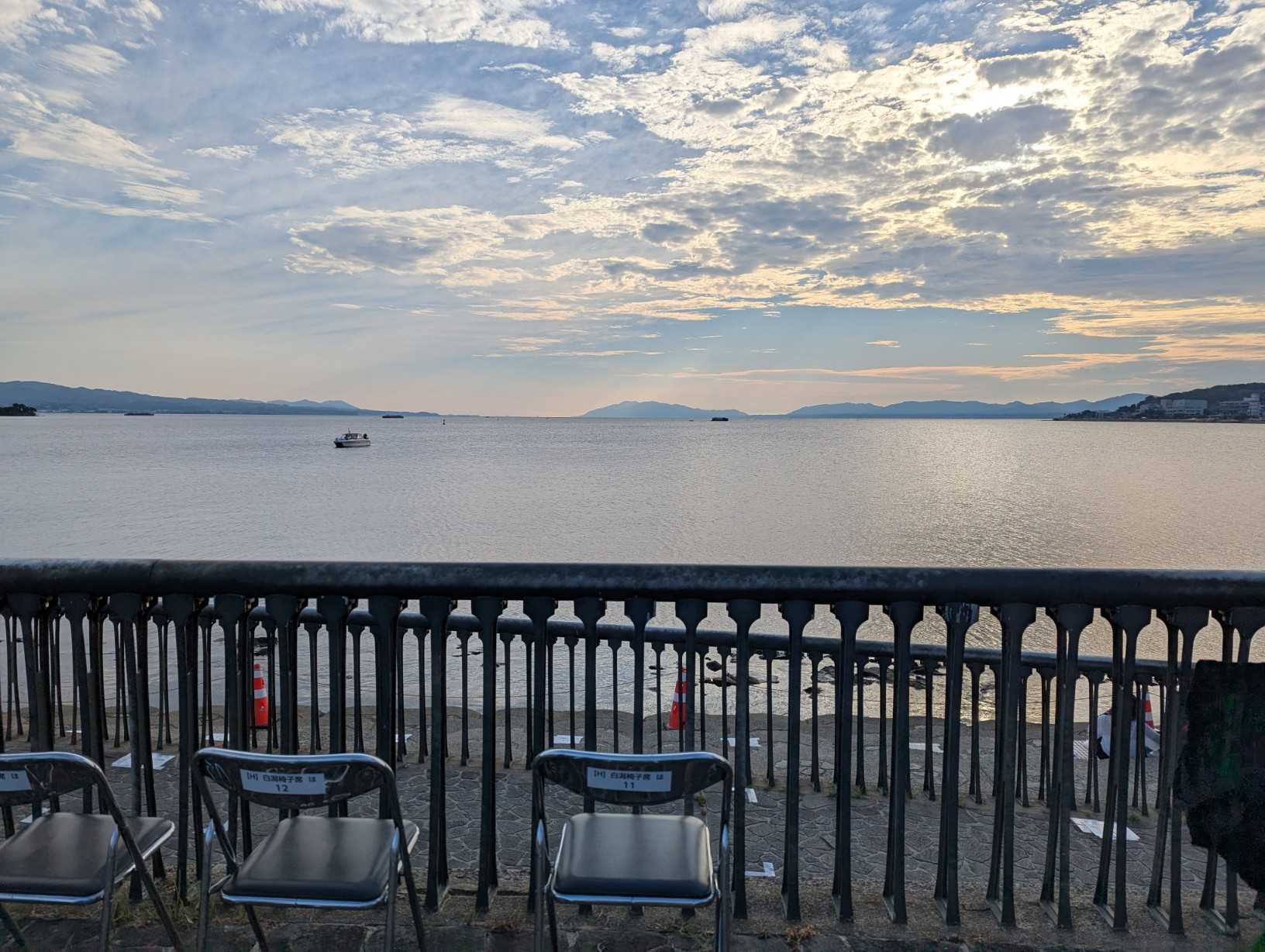 日帰り?というか、お昼に広島を出て松江の水郷花火を見に行き深夜に戻る…というバスツアーに参加しました。ほぼ次回参加に向けて自分へのメモです。広島駅を14時に出発。途中、2回の休憩を挟んで17時半に会場に到着しました。宍道湖そばで風が通るとはいえ、30度越えで直射日光が当たる場所は辛い!島根美術館のチケット付きだったので、ここで涼んで待てという事でしょう。と、思いつつ、松江駅までお土産買いに散歩して来ました(笑)湖から離れると風も無くて蒸し暑い…座席は有料席。申込みが早かった人から前の列で、私は残り僅か!でギリギリで申し込んだので最後尾席。と言っても3列目です。有料席内にトイレがあり、終了後は混雑して行列でしたが、それ以外の時間帯は並ばずに使用できました。花火大会に来るのは初めてだったのでトイレ混雑ヤバい!とかの情報を見て、念のために大人用おむつ+尿漏れパッド装着でしたが、不要だったようです。万が一でも安心という意味では心強かったですが。20時開始ですが19時には座席に付くように添乗員さんからアナウンスされてましたが、確かに19時過ぎると薄暗くて、もう座席番号が見えない。自分の席がどこかわからない。そんな感じなので、早めに座席に戻ってないと大変かも。ちょうど夕日が綺麗な時間なので、宍道湖の夕日を見るのも良いですよ。20時から15分間のドローンショーのあと45分間の花火。迫力があって湖に映る花火も素敵で最高でした!動画から切り出した画像ですが、どうでしょうか?花火大会を遠くから見るというのは何度かありましたが、こんなに近くで見たのは初めてで感動しました!視界いっぱいに広がる花火!凄い!また来年も見たい!申込み始まったらすぐ申込んで前の列に行く!そう決意しました。帰りは会場から団体バス駐車場まで歩いて20分。微妙に遠い上に風が通らず蒸し暑くて結構キツかった。帰りも休憩2回はさんで広島駅についたのが25時。もうちょっと掛かるかと思ったので案外早かったです。今回の持ち物。凍らせた麦茶500ml2本と凍ってない麦茶1本を保冷バッグに。冷えた麦茶2本をカバンに。冷えた麦茶2本目消化中に凍らせた麦茶1本(まだ半分凍ってる)を表に出し溶かす。凍らせた麦茶1本目の消化中、帰りのバスの車内で凍った麦茶(まだ氷の芯が残ってる)もう1本取り出し。家に帰った時には麦茶1本がまるっと残ってる。そんな感じだった。保冷バッグ、予想外に頑張ってた。食べ物は今回は持って行きました。でも会場の屋台+、周囲のコンビニ・居酒屋がこぞって屋台出していて、食べ物の調達は楽に出来そうでした。