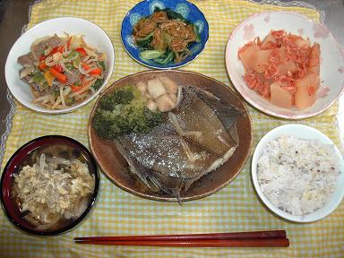 低カロリーで満腹6品で569カロリー今夜のオススメは「おかずになる、牛しゃぶサラダ」です♪材料2人分/1人分168カロリー牛肉100g パプリカ80g もやし100g(半袋弱) セロリ100g(2枚位 )※野菜は何でも良いで~すA)醤油大さじ2 ごま油小さじ1 いりごま小さじ1 すりにんにく2~3片(12g) 豆板醤 小さじ1牛肉は熱湯でさっとゆでて水気を切る。パプリカとセロリともやしは一緒に熱湯でさっとゆでる。(1)を混ぜ合わせて温かいうちに(A)で和える。冷めたら器に盛って出来上がり。にんにくでパワーもりもりv(=∩_∩=)vピリッとしてておいしかったで~すタレが少ないので、温かいうちに味を馴染ませるのがポイントで~す。 「カレイと麩の煮付け」材料2人分/1人分117カロリーカレイ切身2切 麩 小10個(8g) ブロッコリー100g煮汁)醤油・酒 各大さじ1 顆粒だし2g 水200cc エリスリム1.5g(砂糖の場合大さじ1/2、1人分8.5カロリー増)※カロリーより味追求の場合は「みりん」大さじ1/2程(20カロリー)追加して下さいネ♪麩と水で戻して軽く絞る。ブロッコリーはレンジで軽く加熱。鍋に煮汁を煮立て、カレイを入れて落し蓋をする。再び煮立ったら煮汁をかけながら10分位煮て取り出す。(4)の鍋に水を少量(分量外)加えて煮立て、麩とブロッコリーを入れて煮含める。 カレイと一緒に器に盛って出来上がり。 栄養士さん直伝の「ダシいらずの大根の煮物」1人分34カロリー今回は、お塩は入れませんでした。1/27に作り方&画像があります。ポチッとしてみてね♪その日の晩ご飯は5品で514カロリーでした。大根や干しえびは、ローカロリーなので、好きな量で良いと思います。 またまた、栄養士さん直伝の「小松菜のナメタケ和え」なんと小鉢1個分で25.5カロリー材料 小針2個分小松菜 200g なめたけ大さじ2コレだけ(笑)小松菜を茹でて冷水に取り、お浸しを作る。ナメタケで和える。ホウレン草がオススメですが、青菜なら何でも良いと栄養士さんが言ってましたあらっ小松菜泥棒発見~君、君、現行犯だよ~U-ェ-;Uゞウーン-----ヾ(`ε´)ノ◎ー◎ タイホタイホ!!この顔、笑っちゃいますね~ 「キノコと卵の椀U^ェ^U ワン」材料2杯分/1杯56.5カロリー卵M1個 エノキ1/2株 シメジ1/2株 顆粒ダシ2g 醤油 大さじ1「ごはん」100g 168カロリー 満腹満腹( ̄▽ ̄)=3 プハァー
